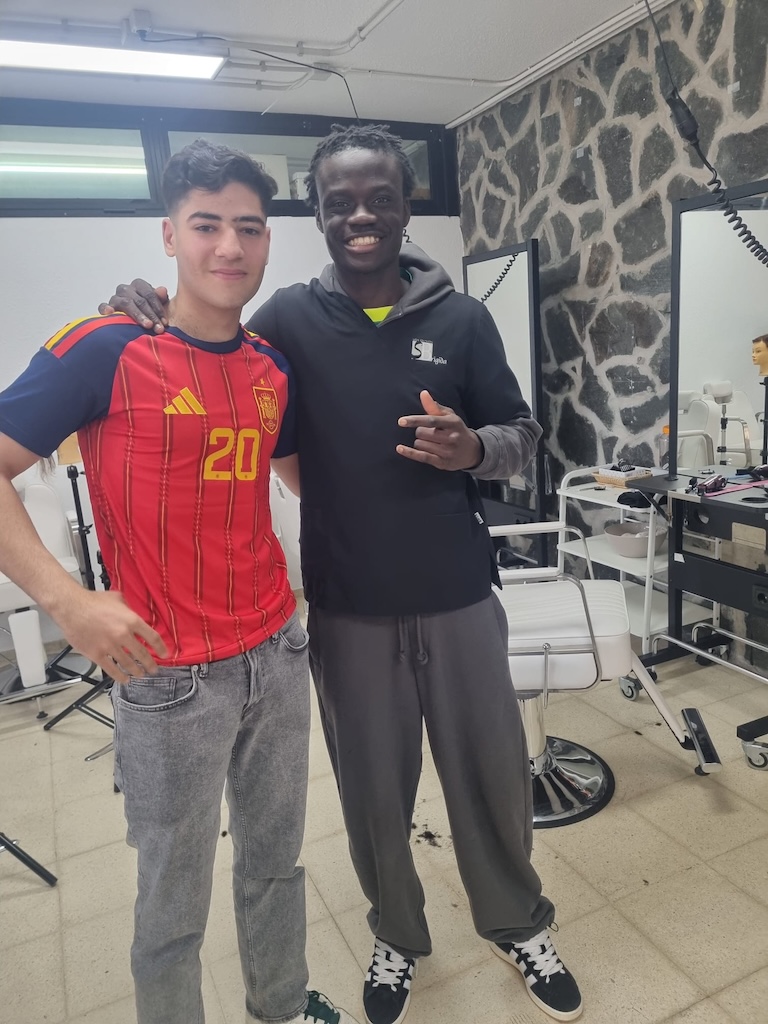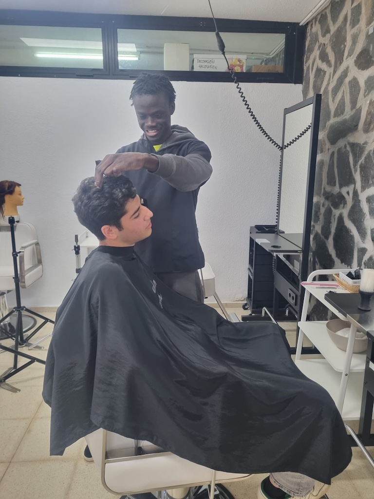 Dans l’atelier coiffure, nos deux élèves en échange se font proposer une nouvelle coupe de cheveux réalisée par Sidibe qui exerce déjà dans un salon de coiffure de Las Palmas, mais suit des cours au lycée encore les lundis.
