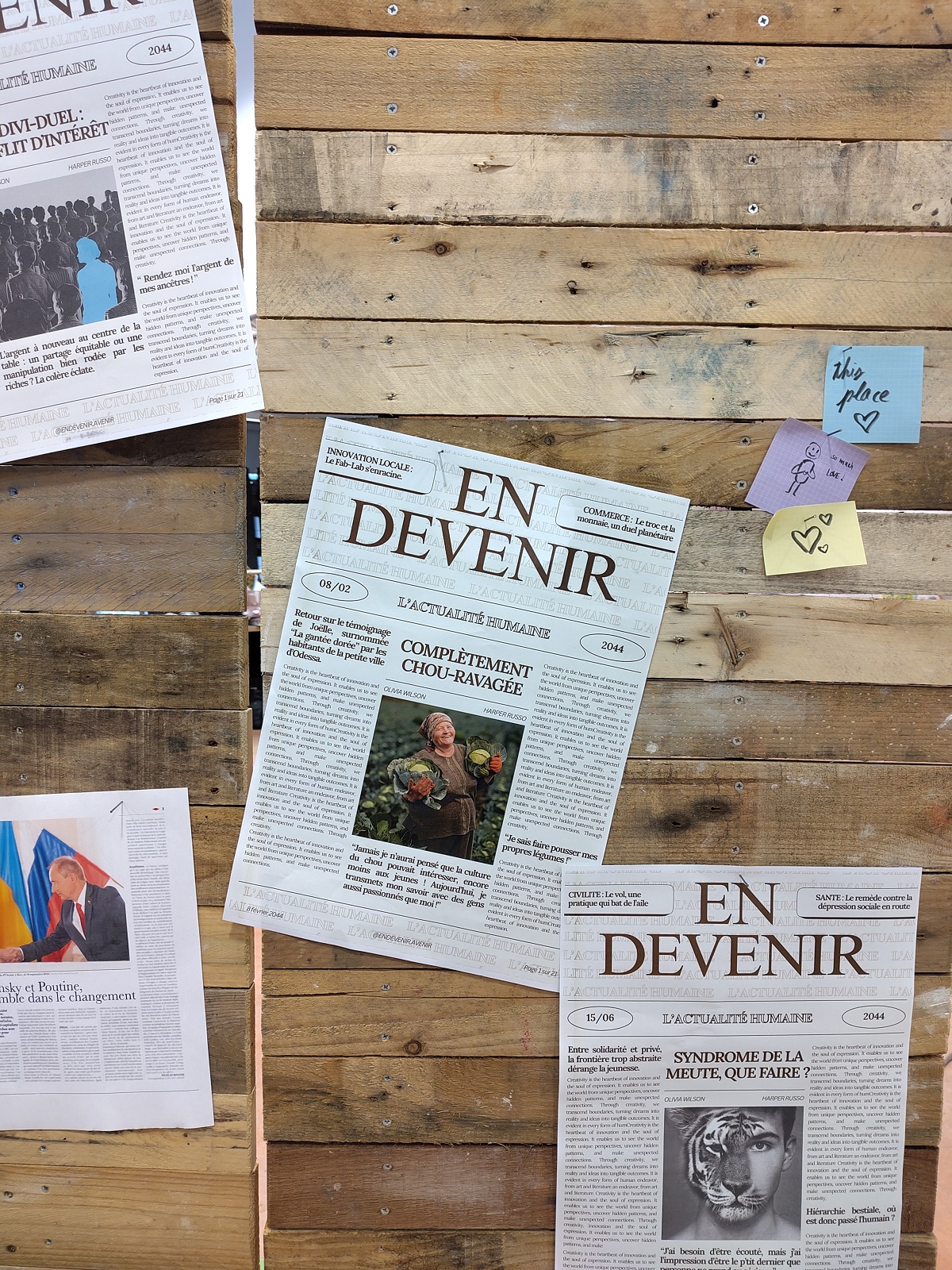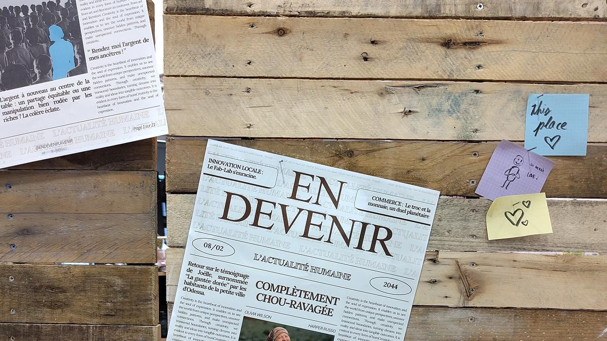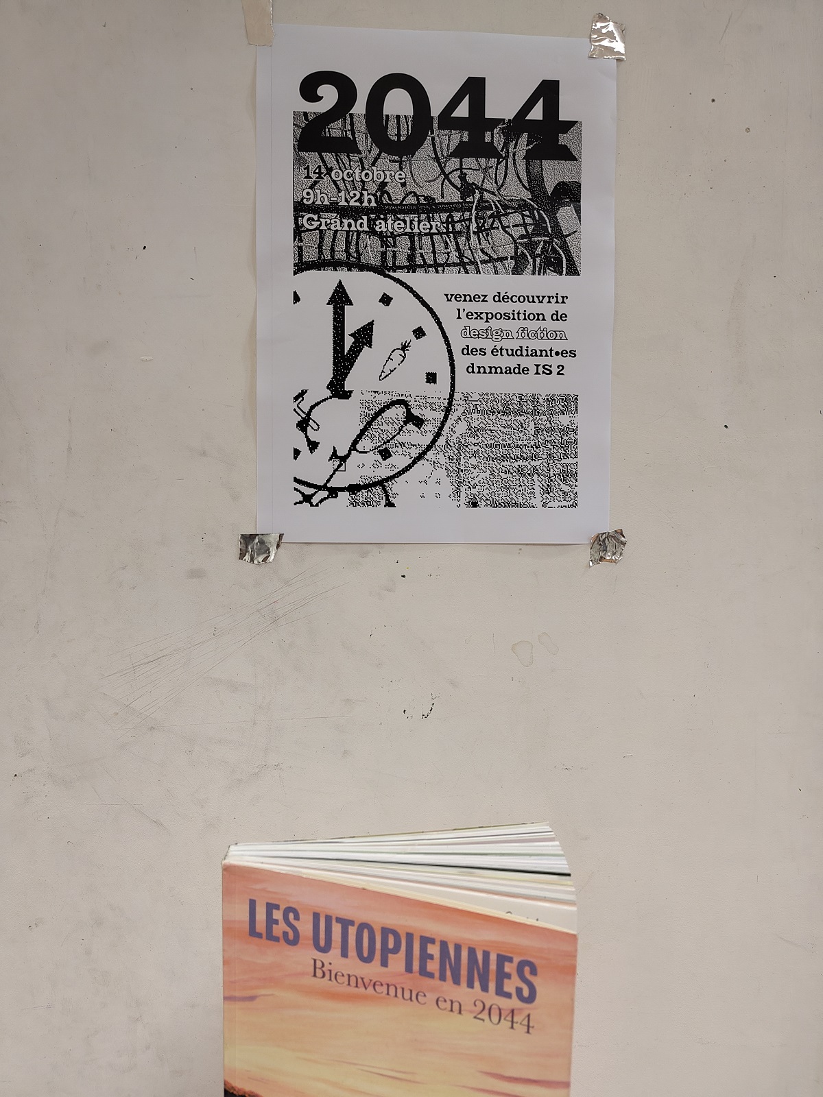 Les étudiant•es de deuxième année innovation sociale ont interprétés les textes du livre Les Utopiennes : bienvenue en 2044 emprunté au CDI, pour proposer une exposition immersive.
