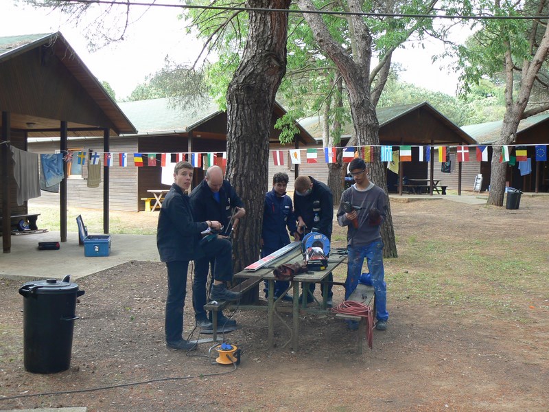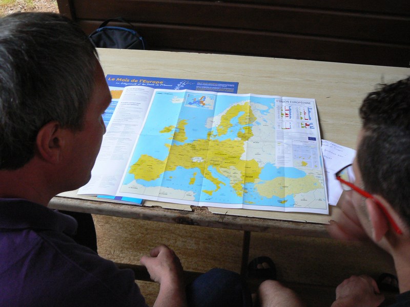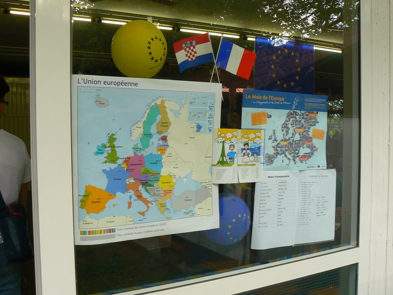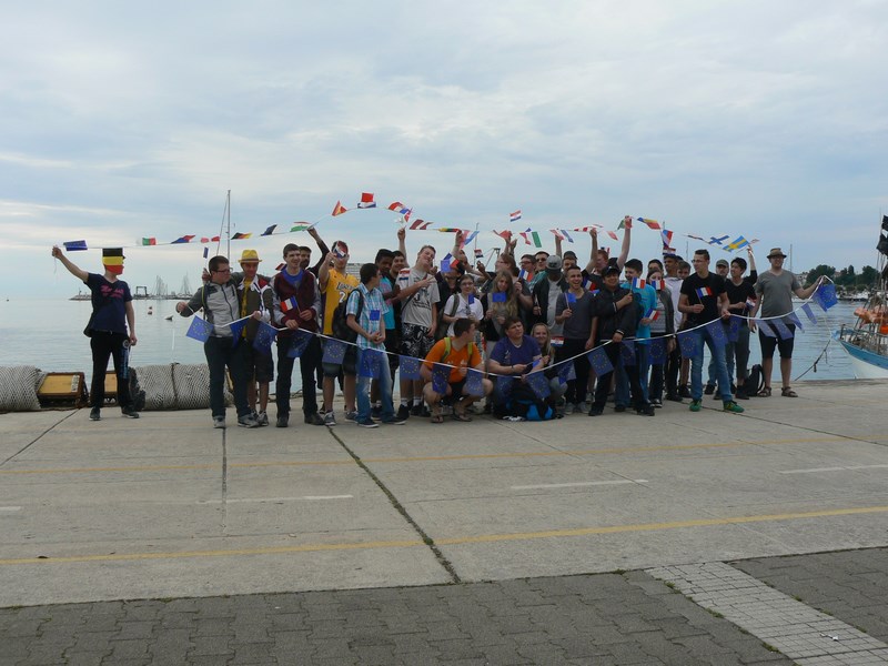 Mais ce chantier école ne s’est pas uniquement limité à du travail. Tous les jours après 15 heures, les élèves ont bénéficié de temps libres qui leur ont permis de faire diverses activités : sports, loisirs, visites des environs, excursions… Le 9 mai, la « Journée de l’Europe » a été fêtée sur le port maritime de la ville voisine d’Umag et toute la semaine, quelques discussions sur le thème de l’Europe ont été menées grâce aux documents donnés par la région du Grand Est et le Centre d’Information sur les Institutions Européennes : à quoi sert l’Europe ? Quelles sont les différences entre les différents pays qui la composent ? Y a t-il possibilité d’aller travailler ou d’effectuer un stage dans un pays autre que le sien et en particulier pour des élèves issus des filières professionnelles ? …. Sans oublier l’apprentissage de quelques mots en langue croate. Par leurs décors, plusieurs endroits dans le camp rappelaient à tous que « Le mois de l’Europe » était note fil conducteur : fanions européens et drapeaux des différents pays, ballons, documentation, cartes explicatives… apparaissaient ici où là.