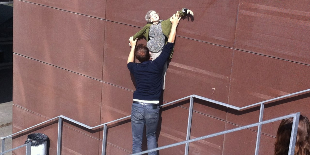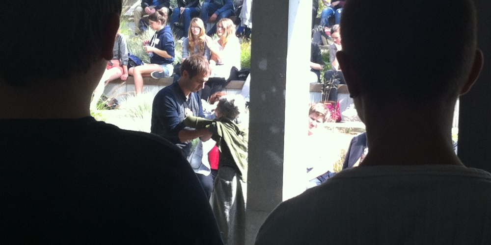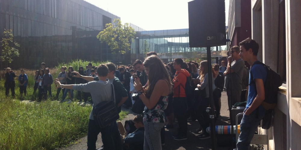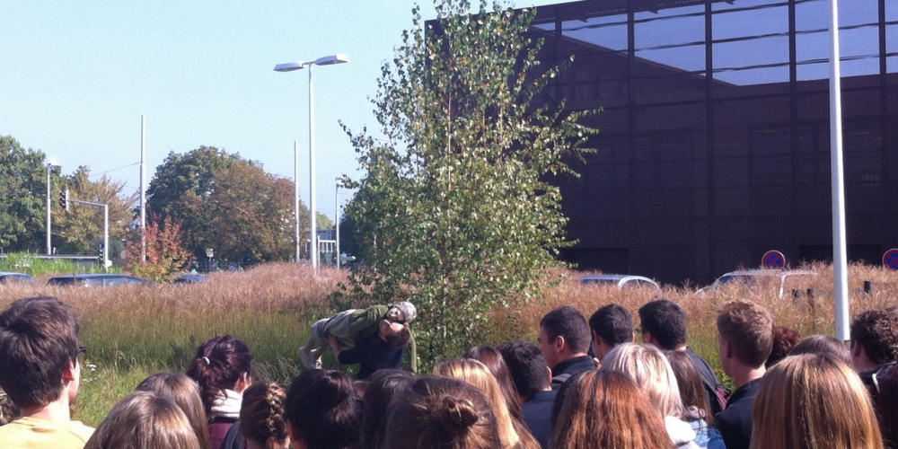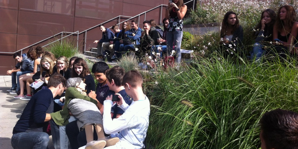 Le temps d’une pause méridienne, une équipe du TJP est venue surprendre les élèves au lycée : déambulation d’un marionnettiste dans la cour et le long des bâtiments pour accrocher l’attention des passants, puis performance en plein air pour inaugurer le spectacle “Des nouvelles des vieilles” de Julika Mayer qui se jouera bientôt au théâtre.
