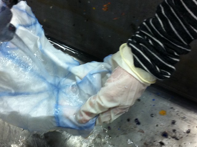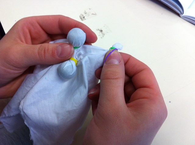 Dans le cadre de l’enseignement des arts appliqués et du thème “aléatoire”, les élèves de terminale TAA3 se sont initiés à certaines techniques de base du Shibori. En effet, le Shibori a des techniques précises, mais les résultats ne peuvent pas être totalement connus d’avance. Il faut beaucoup d’expérimentations, d’essais et de savoir-faire, pour acquérir peu à peu une expérience qui permettra d’obtenir des résultats moins incertains. Ils ont expérimenté deux notions principales et pu comparer les résultats obtenus une fois les échantillons séchés . Les élèves ont d’abord fait des essais de différentes différentes sur des textiles variés (coton, soie – fibres naturelles, puis des essais d’immersion plus ou moins longues dans le bain de teinture.