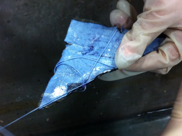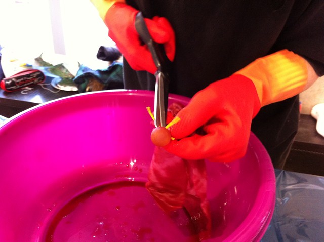 1- teinture : chacun a choisi sa couleur et a préparé son bac de teinture Dylon offert par le lycée. Ils ont procédé aux expérimentations, à l’immersion des échantillons, au déballage et aux coutures défaites des échantillons teints, à la suspension et à la mise en séchage puis au nettoyage. Il a été conseillé à chacun de marquer sur un calepin la façon dont il avait procédé pour chaque essai afin d’en garder une trace et de le numéroter pour ses créations futures.
