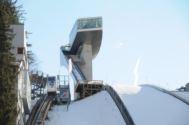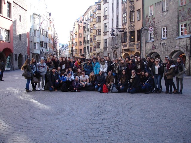 Au petit matin 9O élèves et 8 accompagnateurs ont pris la route pour aller à la découverte de « l’art et de l’architecture d’hier à aujourd’hui », projet transversal histoire, lettres, allemand, architecture et arts appliqués. Les deux bus affrétés par le lycée Le Corbusier ont fait escale à Innsbruck, première étape du voyage. Une classe avait rendez-vous avec leurs correspondants autrichiens et leurs deux professeurs pour une visite de la vieille ville. Les deux autres classes sont allées visiter la Schanze, ouvrage de saut à ski réalisé par l’architecte Zaha Hadid pour les jeux olympiques d’hiver, située aux abords de la capitale du Tirol. Puis les deux groupes sont repartis pour rejoindre ensemble Vienne, berceau de l’Art Nouveau au cœur de l’Europe.