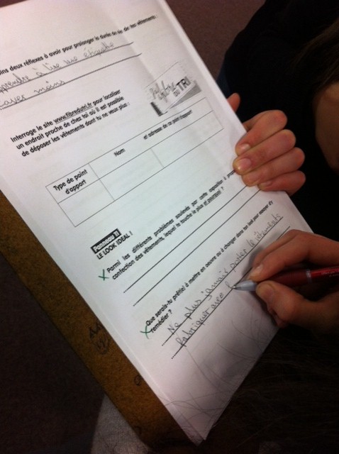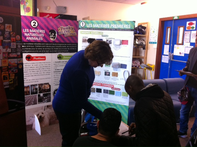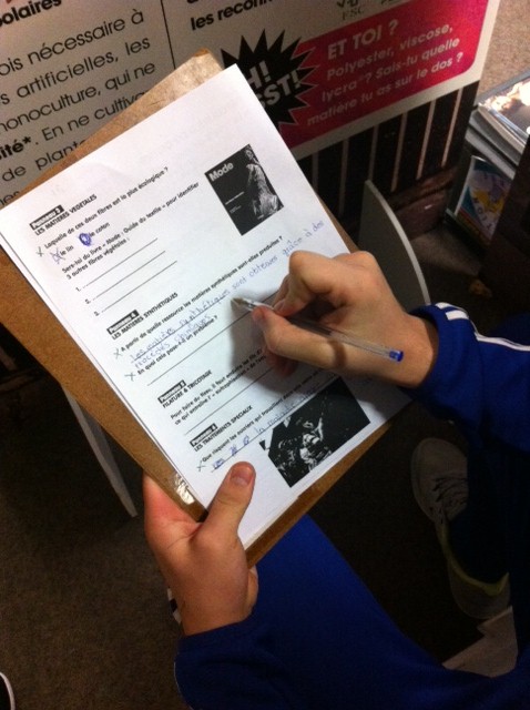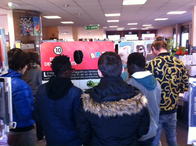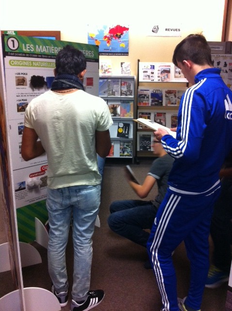 Les professeurs documentalistes ont offert la possibilité aux autres enseignants d’organiser des visites par demi classe, à l’aide d’un questionnaire de découverte conçu spécialement pour les élèves : ce parcours a permis aux élèves de mieux appréhender les différents impacts qu’ont nos “looks” sur la planète à partir d’une lecture analytique des panneaux, mais aussi par le biais de petites recherches dans des documents choisis ou sur internet.