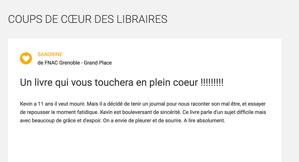 Tout comme la famille d’accueil de Kévin, J-B Aubert se voit comme un “relais”, un “passeur” qui prête sa voix à la douleur de Kévin, mais aussi à son espoir. Car, oui, ce roman est noir et tragique, mais il est aussi lumineux et se fait le vibrant écho d’une jeunesse pleine d’idées et d’espérances.