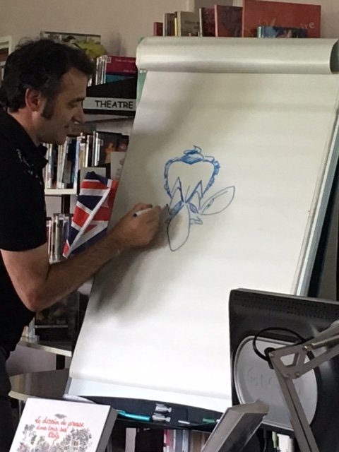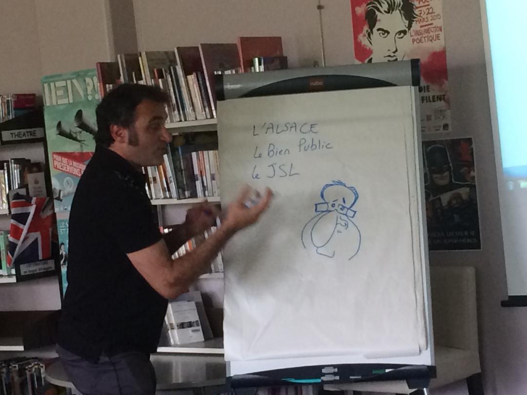 Le dialogue a été riche entre l’illustrateur de presse et les jeunes autour de thématiques telles que “qu’est-ce que le dessin d epresse ?”, “Peut-on rire de tout ?” mais aussi les notions de censure, racisme, le dessin militant au secours de la planète ou encore des droits des femmes…
