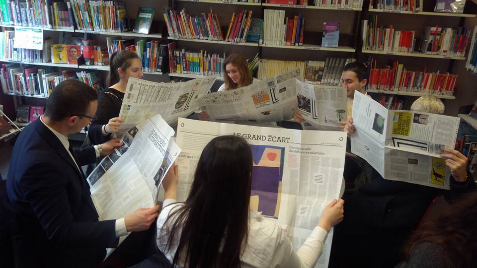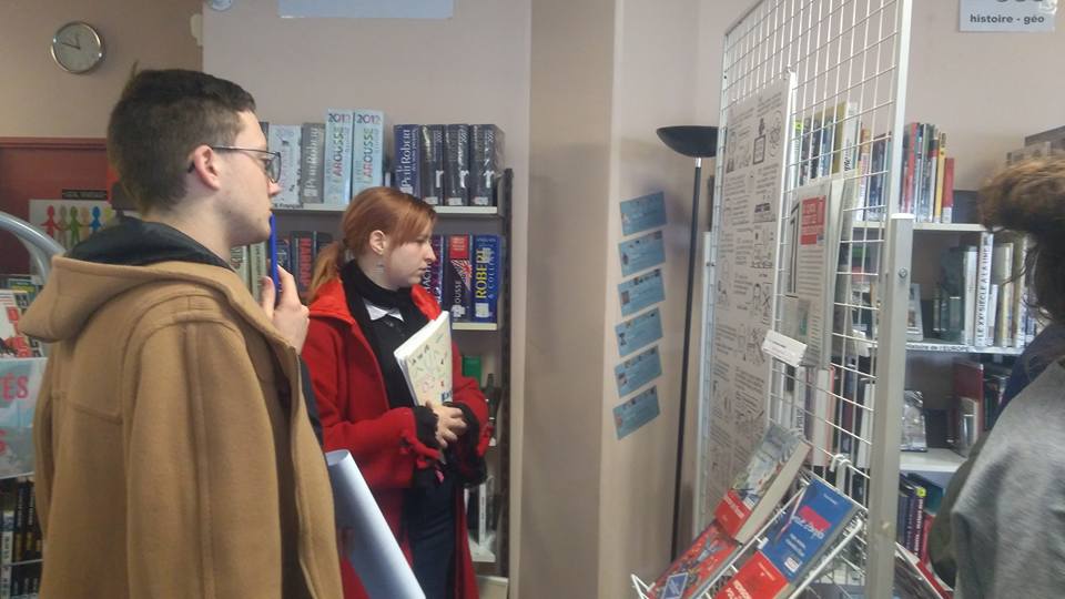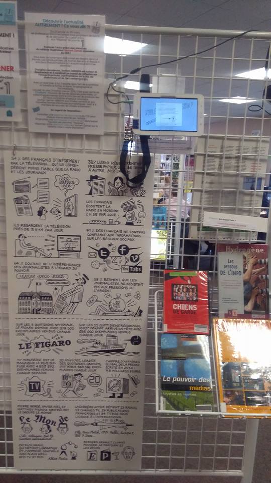 Ils ont aussi pu emprunter tous nos exemplaires du journal Le 1 dans lequel figurent ses planches “Repères”, mais aussi découvrir la sélection vidéo sur Jochen Gerner sur la tablette numérique mise à disposition ou lors des séances pédagogiques orchestrées conjointement par les enseignants et les professeurs documentalistes !