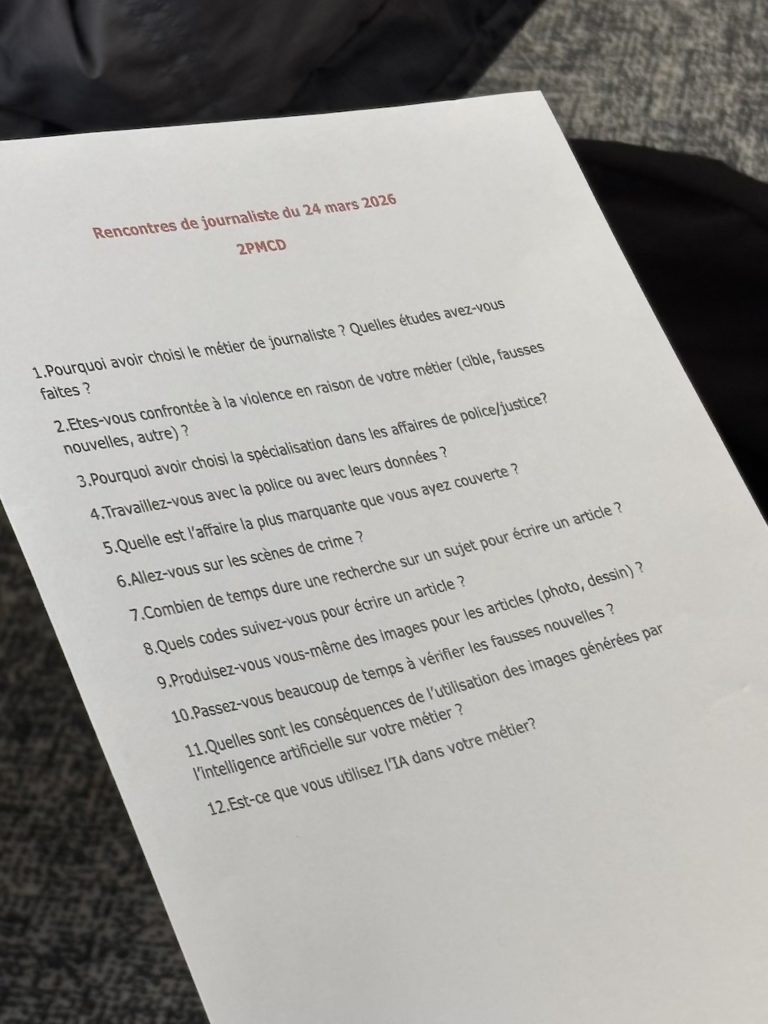 Elle nous a parlé de son parcours scolaire, des différentes étapes de son travail depuis la recherche d’informations, avec des enquêtes qui peuvent être courtes mais aussi durer plusieurs mois, jusqu’à la publication d’articles, avec une écriture qui correspond aux codes de l’écriture journalistique (titre, chapô, corps d’article avec l’utilisation des 5W, Who, What, When, Where and Why).