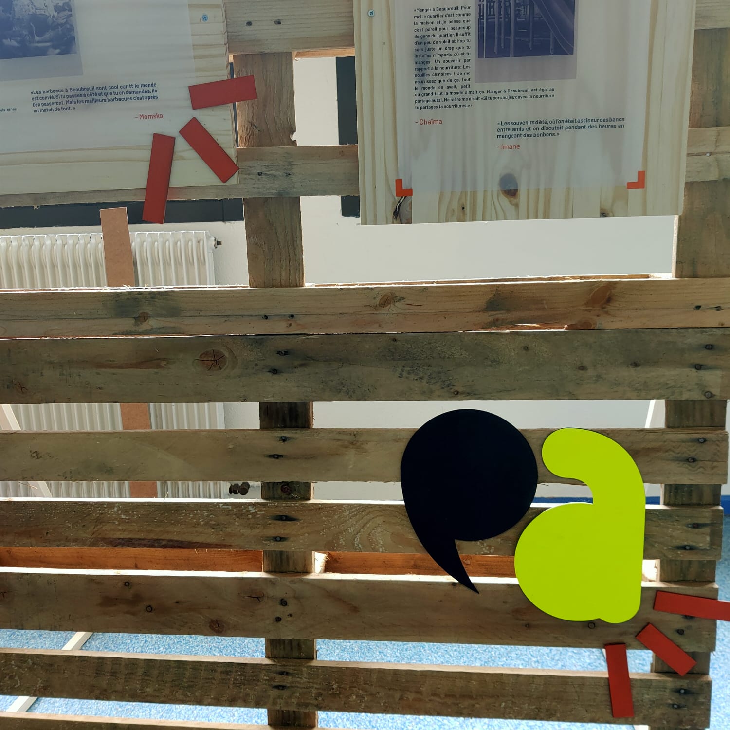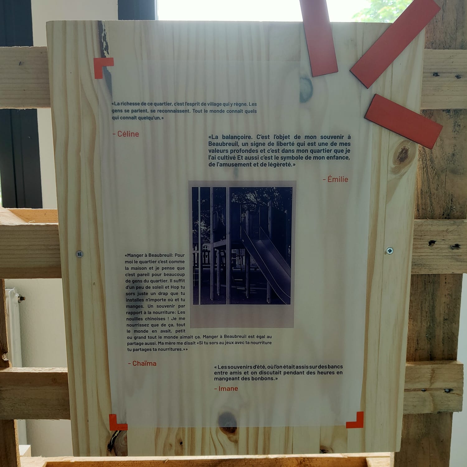 “Ça raconte quoi?” vise donc à valoriser l’histoire des habitants du quartier de Beaubreuil à travers une exposition participative itinérante. En effet le but est d’apporter un nouveau regard sur ce quartier mais aussi de permettre la rencontre et l’échange entre habitants de différents quartiers d’une même ville qui sont rarement amenés à se rencontrer. Ce projet a été pensé en 4 étapes, allant de la réalisation d’outil permettant l’échanges jusqu’à la réalisation du dispositif d’exposition, en passant par la récolte de souvenirs et leurs retranscriptions graphiques et plastiques.