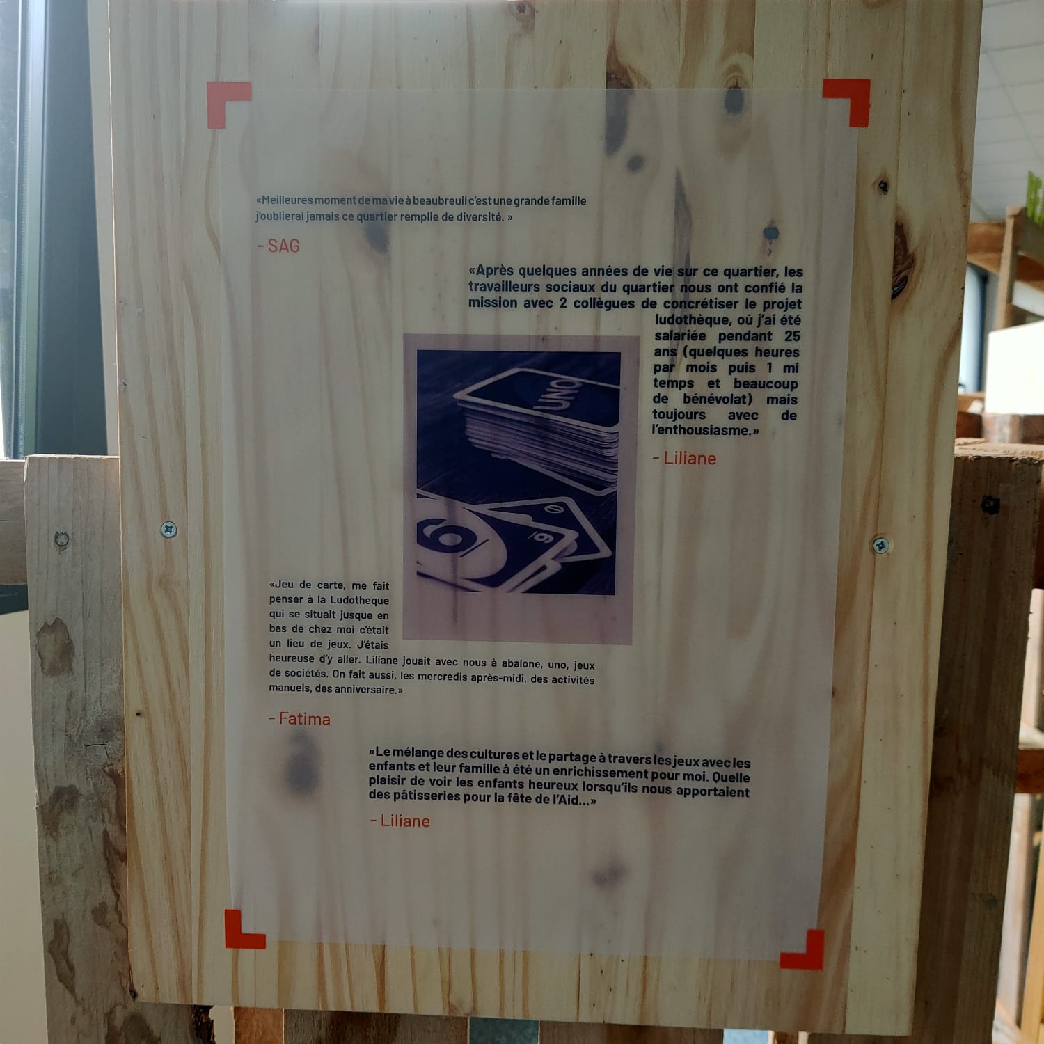 L’atelier s’appuie sur un jeu de cartes permettant d’ouvrir la discussion. Les cartes inspirations aux nombres de 35 sont des illustrations d’éléments pensés pour éveiller des souvenirs. Et les cartes actions aux nombres de 15 sont des verbes d’actions qui peuvent se vivre dans le quartier tel que par exemple “Manger à Beaubreuil” ou encore “Rencontrer à Beaubreuil”.