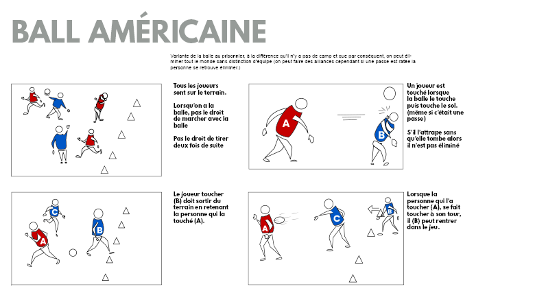 Parmi les règles, certaines sont adaptées à tous types de jeu, d’autres à tous les jeux de balle et les dernières, adaptée uniquement au jeu de balle par équipe. Ces différences sont faites pour cibler les aspects spécifiques dans chaque catégorie de jeux et pouvoir jouer dessus.