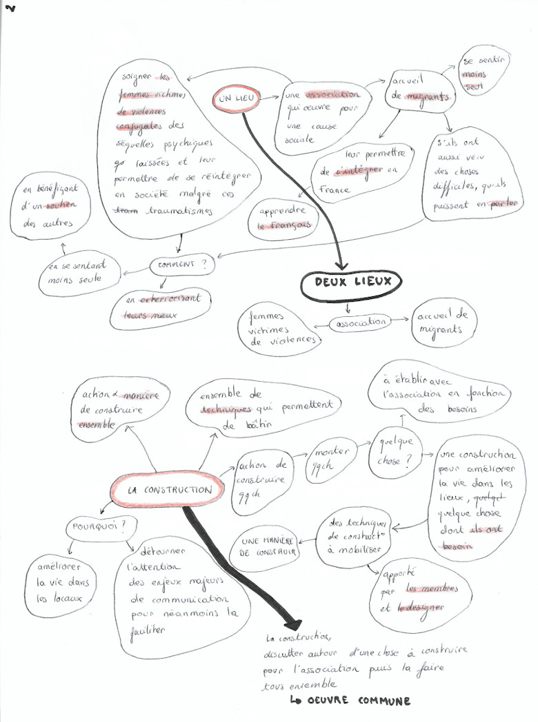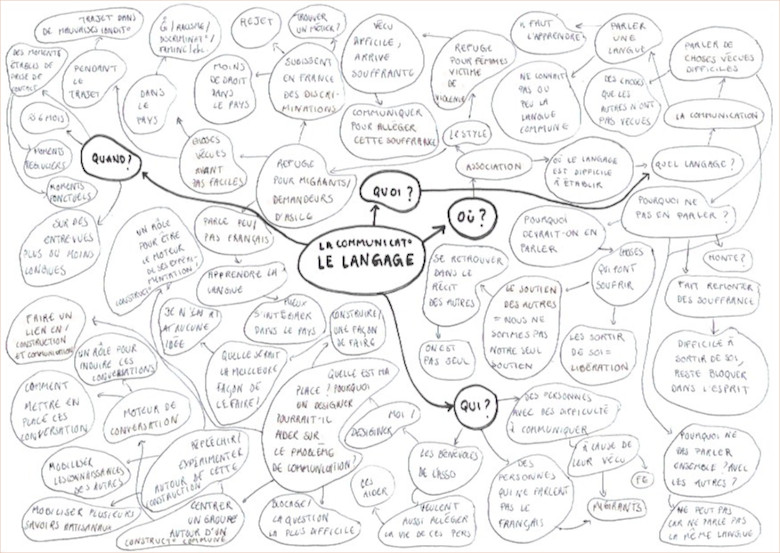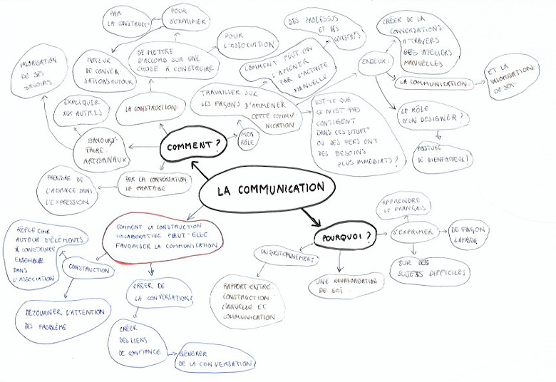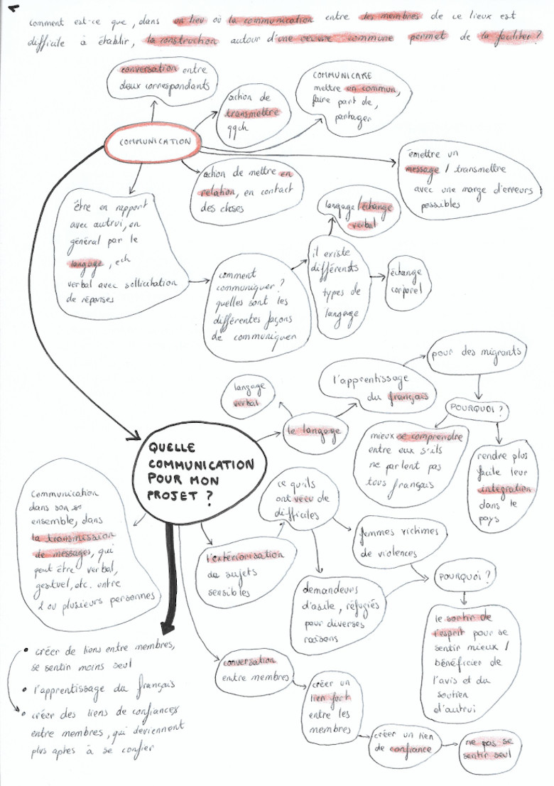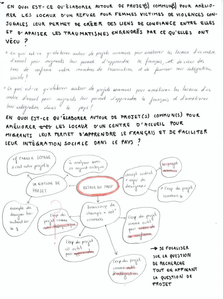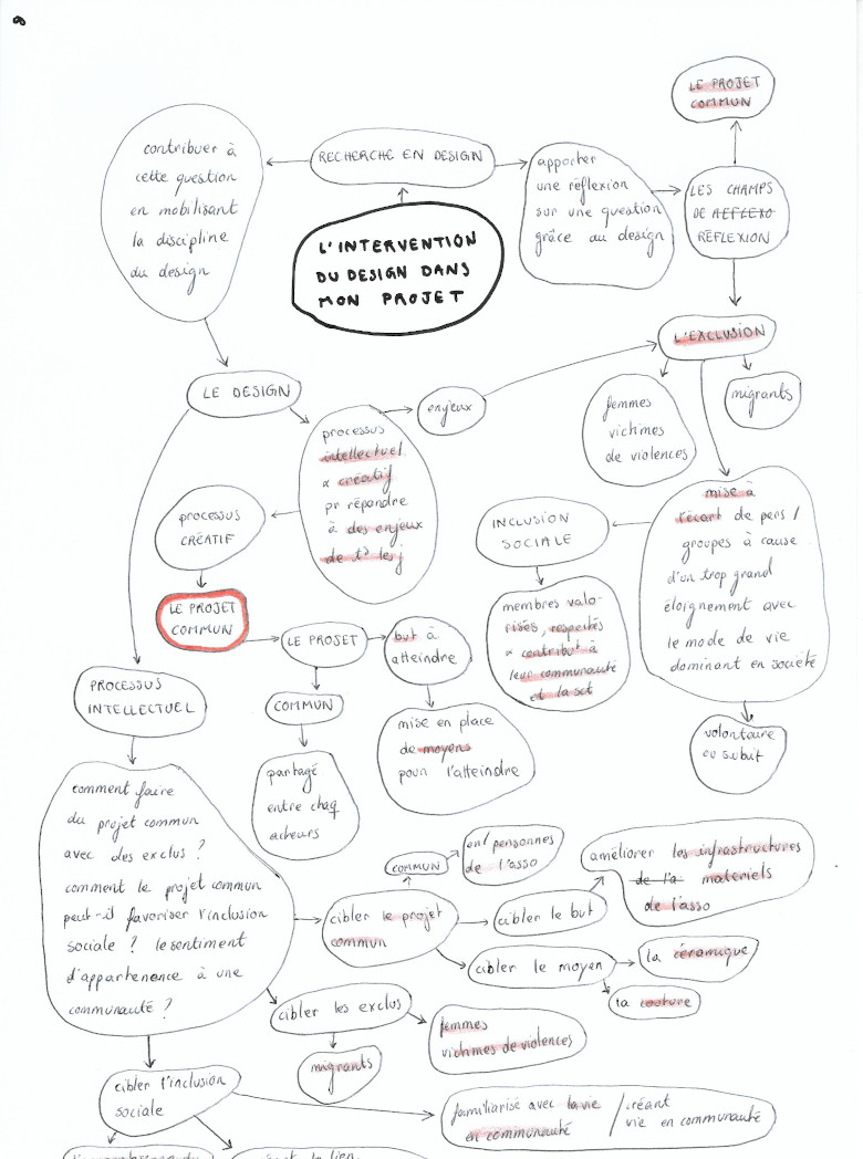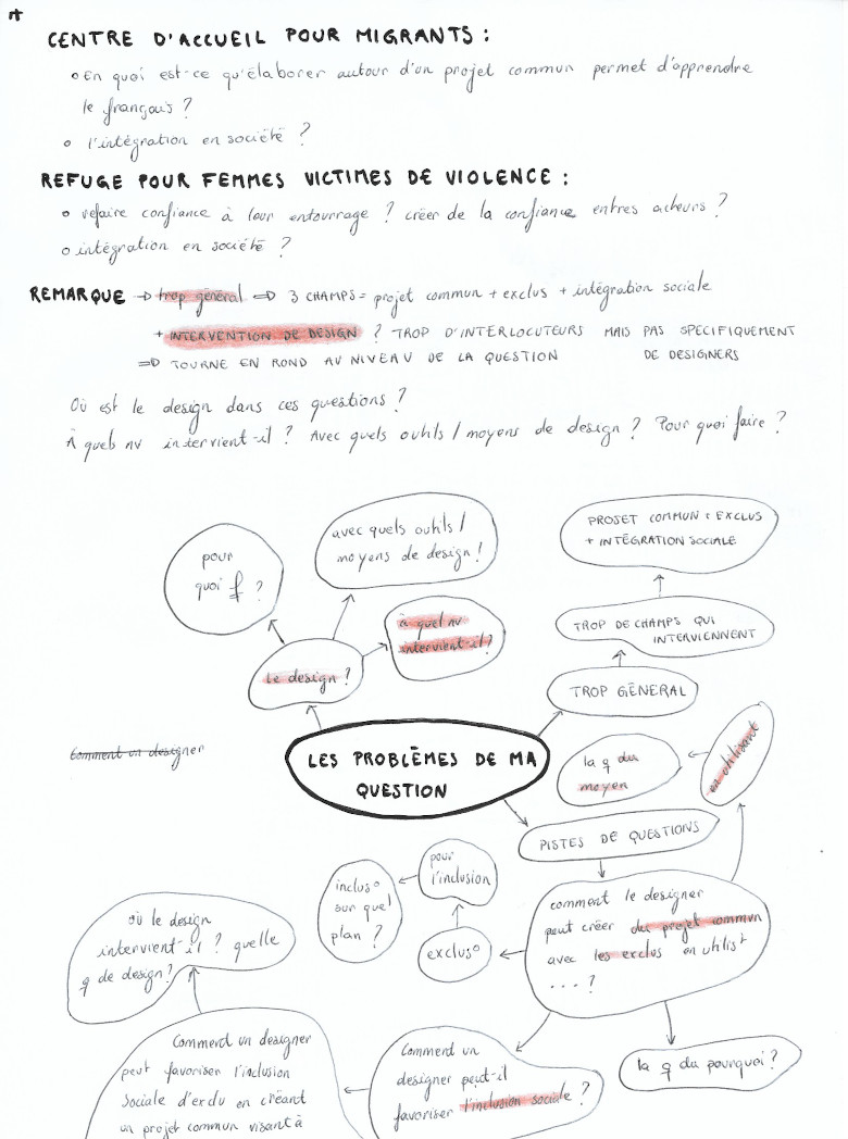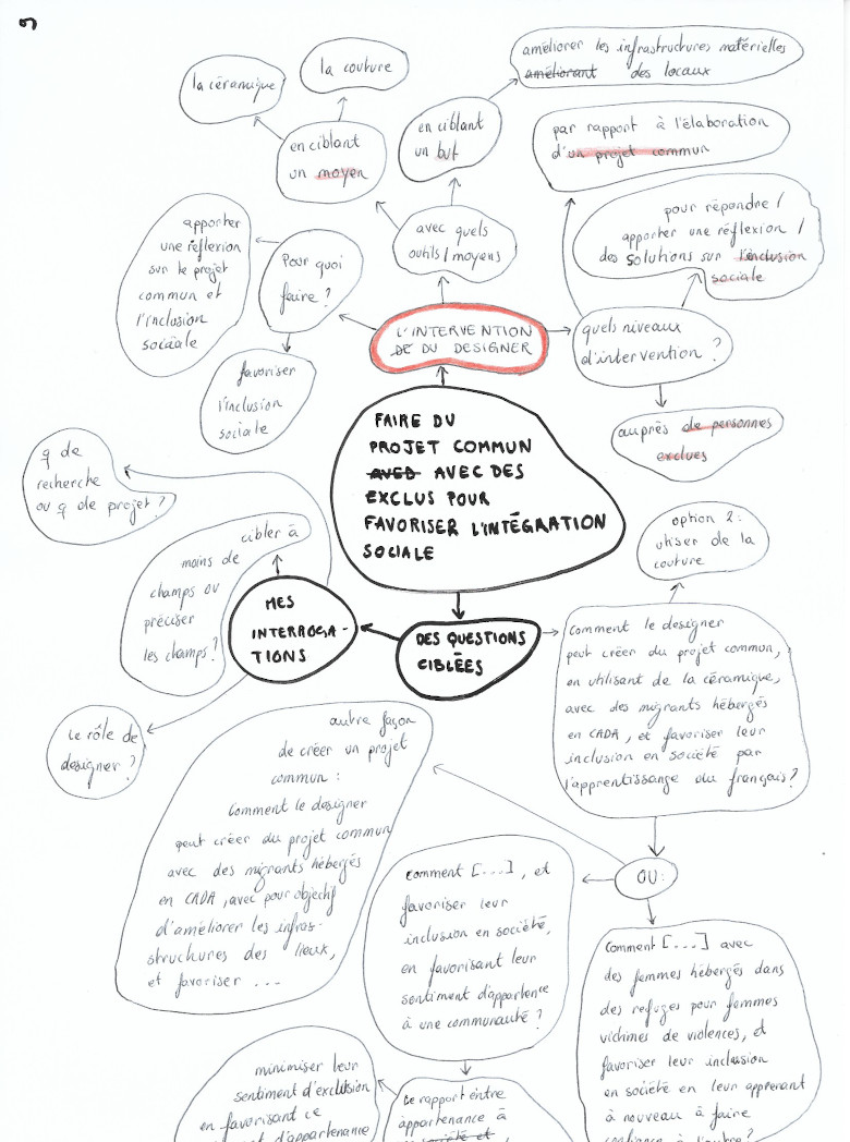 Définir nos intentions de projet nous a permis de savoir vers quel type de recherches nous souhaitons nous orienter. Pour ma part, je souhaite réaliser un projet collaboratif avec des exclus. Afin de préciser cela et pour trouver une réelle question de projet, nous avons ensuite réalisé des cartes mentales qui permettent de poser et d’étendre notre réflexion à propos de nos intentions de projet.